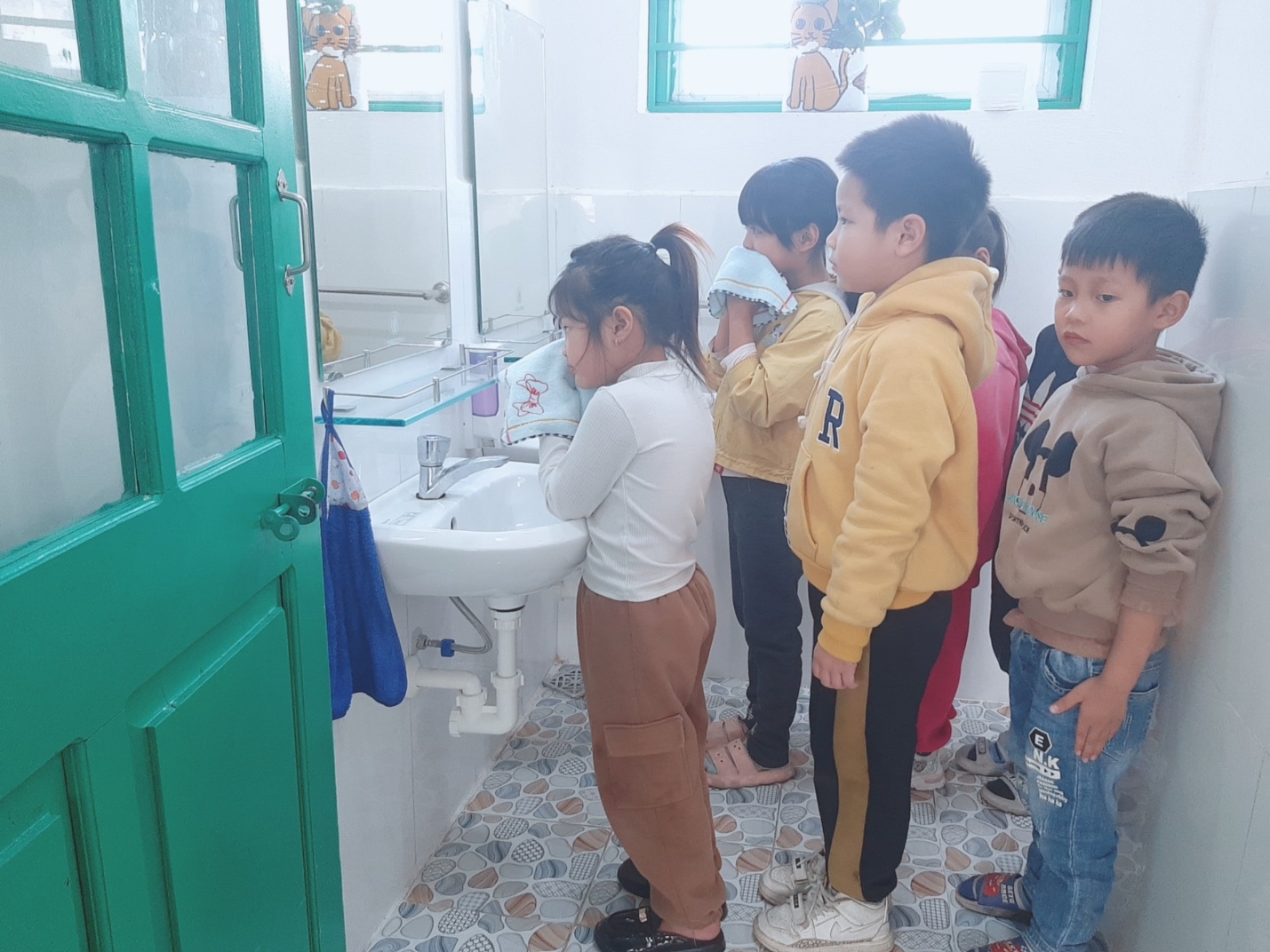 Ngoài việc rửa tay thường xuyên, đúng cách trẻ mầm non cần phải biết vệ sinh lau mặt. Các thao tác lau mặt được giáo viên hướng dẫn trẻ tại lớp từ việc khi nào cần lau mặt và lau mặt như thế nào cho sạch. Các thao tác cần phải nhẹ nhàng, đúng cách và quan trọng hơn cả là làm sao để da mặt trẻ không tiếp xúc lại với phần khăn bẩn. Tại trường khi được cô giáo hưứng dẫn trẻ biết tự rửa mặt tự phục vụ biết giữ gìn vệ sinh cho bản thân mình.
