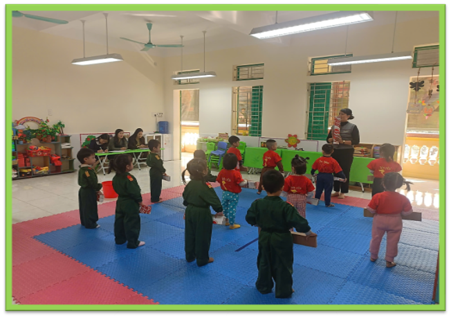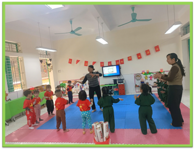 Tại lớp 3 tuổi C3 do cô giáo Đinh Thị Huyền phụ trách, tổ kiểm tra đã quan sát các hoạt động giáo dục thực tế. Giáo viên đã chủ động lồng ghép các bài tập vận động vào mọi khung giờ sinh hoạt: thể dục sáng, hoạt động ngoài trời, trò chơi vận động… Mỗi hoạt động diễn ra tự nhiên, nhẹ nhàng, đồng thời đảm bảo mục tiêu phát triển thể chất và nuôi dưỡng tinh thần hứng thú, tích cực của trẻ.